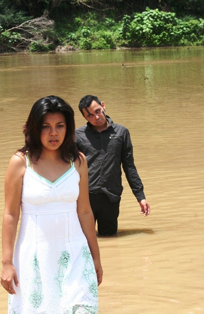 Stefany Escobar y Ricardo Flores, en una escena en el río Lempa, durante el rodaje del cortometraje SOLEDAD.
