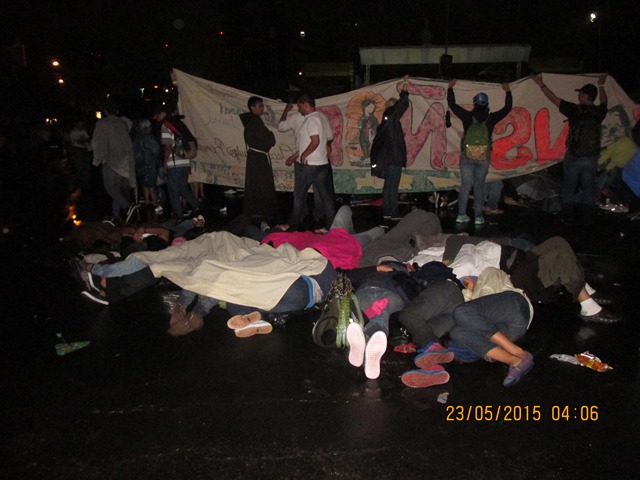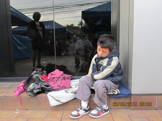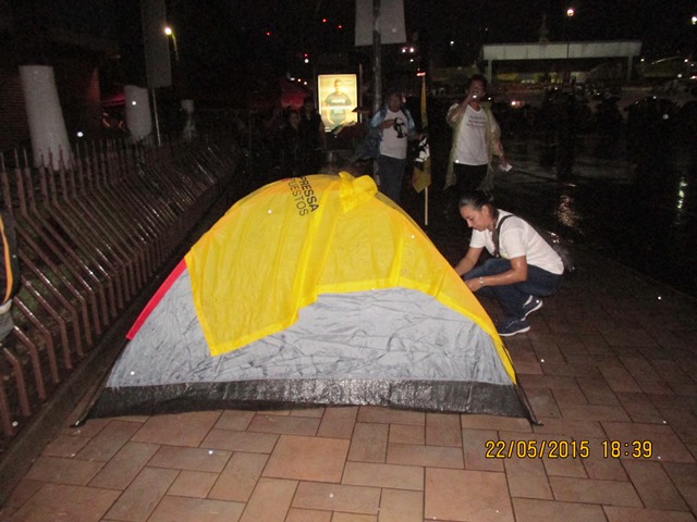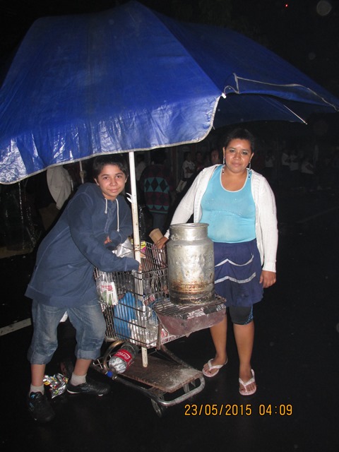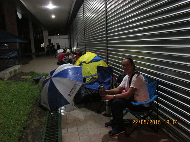 Inicialmente colocamos la tienda de campaña en la acera frente a la torre de Telefónica, pero inicio una garuvita de agua y vimos que varias personas se metían a protegerse en el predio de la empresa de telefonía —cosa que imitamos—. Ya armado nuestro frente y protegidas de la lluvia, como a eso de las 6:30 pm, nos dispusimos a tomar el primer café de la noche. Minutos más tarde se nos unió Gabriel, quien venía desde Ahuachapán.