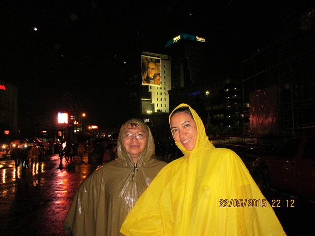 Pishhh Gabriel ¿Por qué no le dice a la Señora que si nos cuida las cosas y que le dejamos una silla para que descanse? Vaya pues…. dice que sí, que ella estará pendiente de todo. Chumpa impermeable y cangurera puestas, caminamos hasta el sitio destinado a la misa, logramos quedarnos a un costado del centro comercial La Campana, y todo bien, ya no llovía.