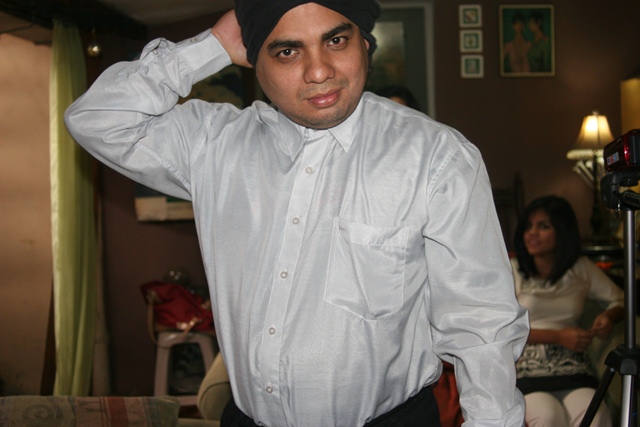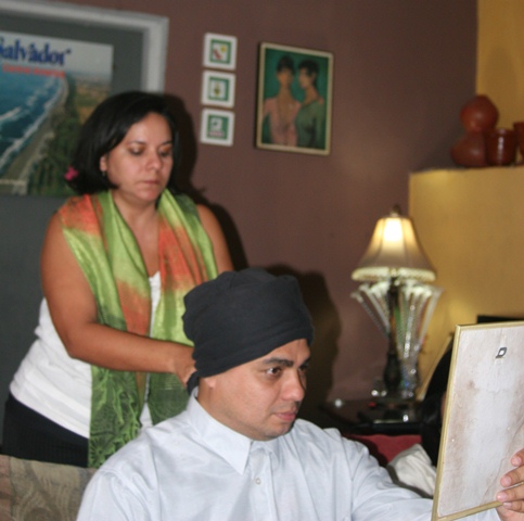 Érika Valencia-Perdomo vistiendo a Romeo Teos para la caracterización del padre de familia.
