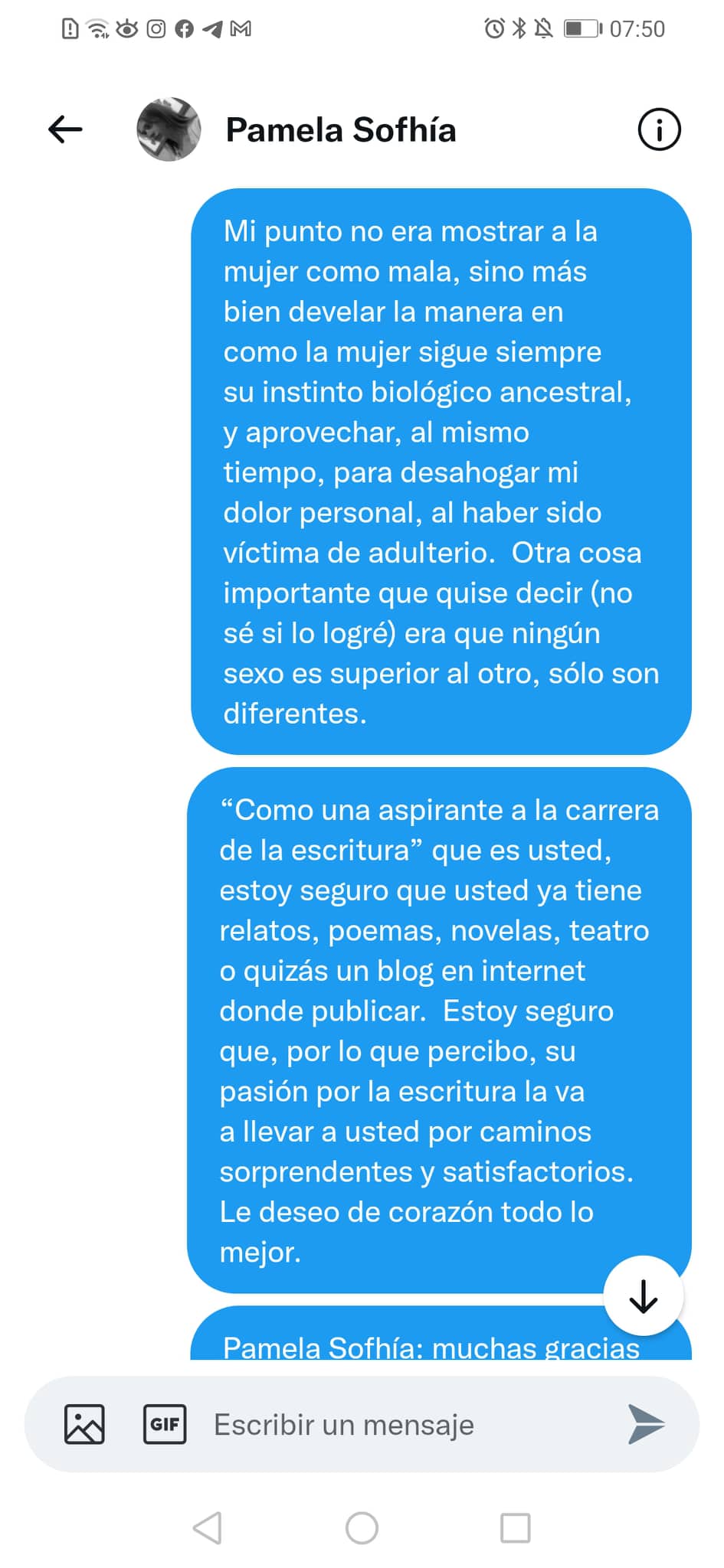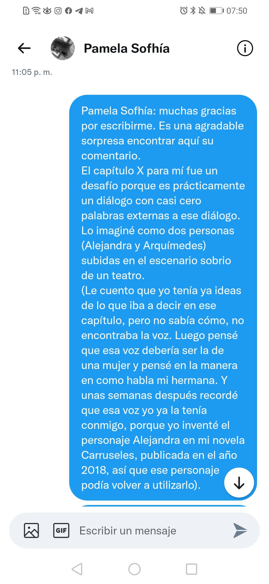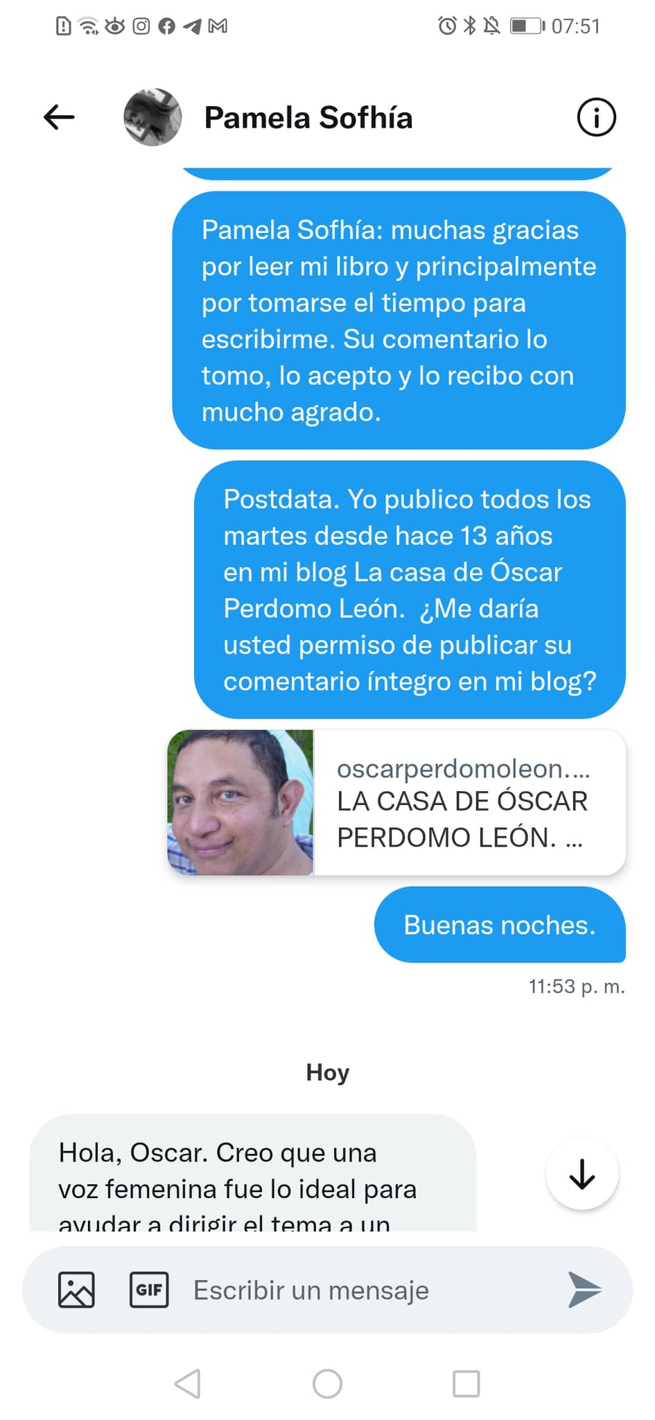 Desde este espacio personal, que es mi blog, le mando a Pamela Sofhía mis agradecimientos por leer mi libro y por mandarme sus comentarios.